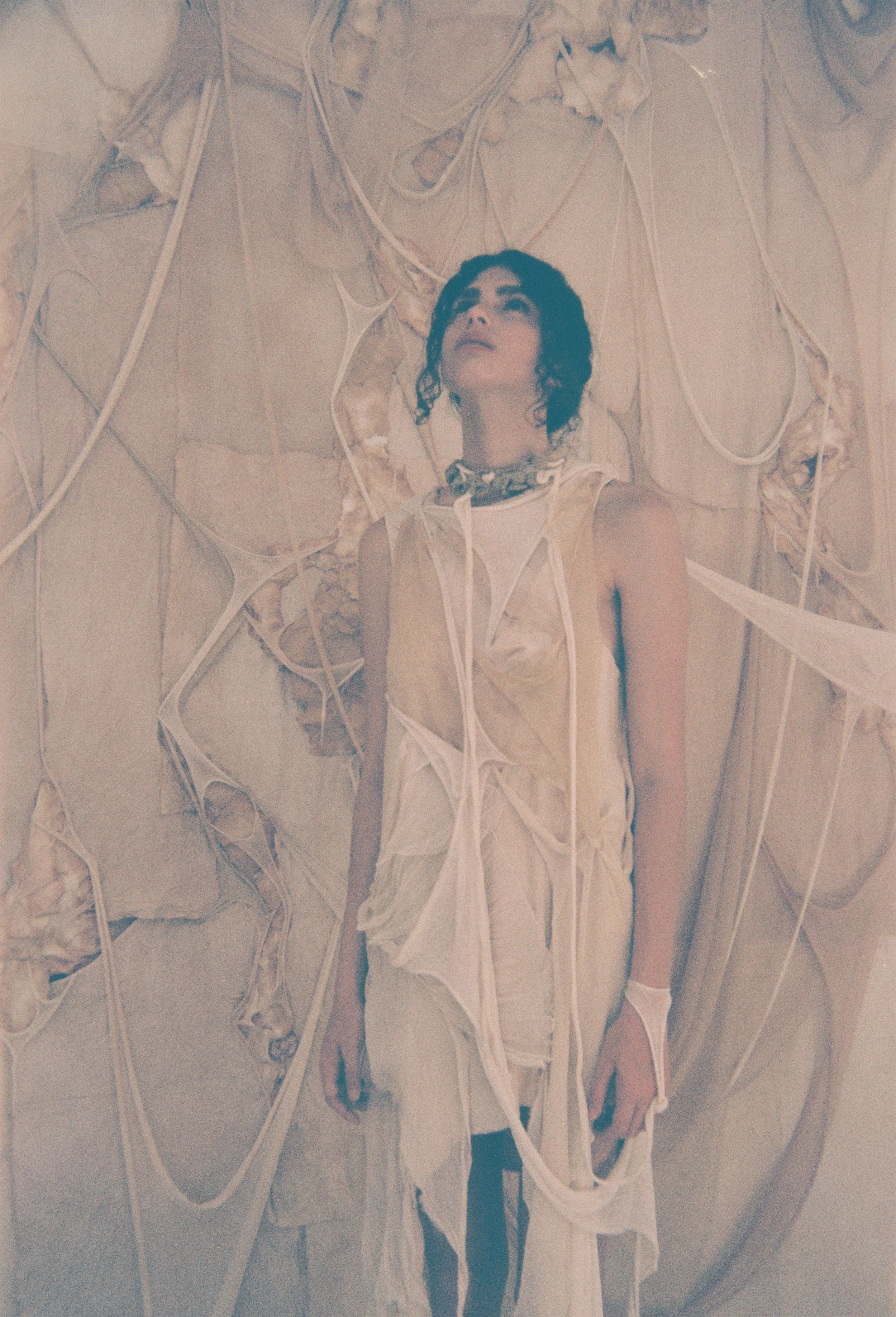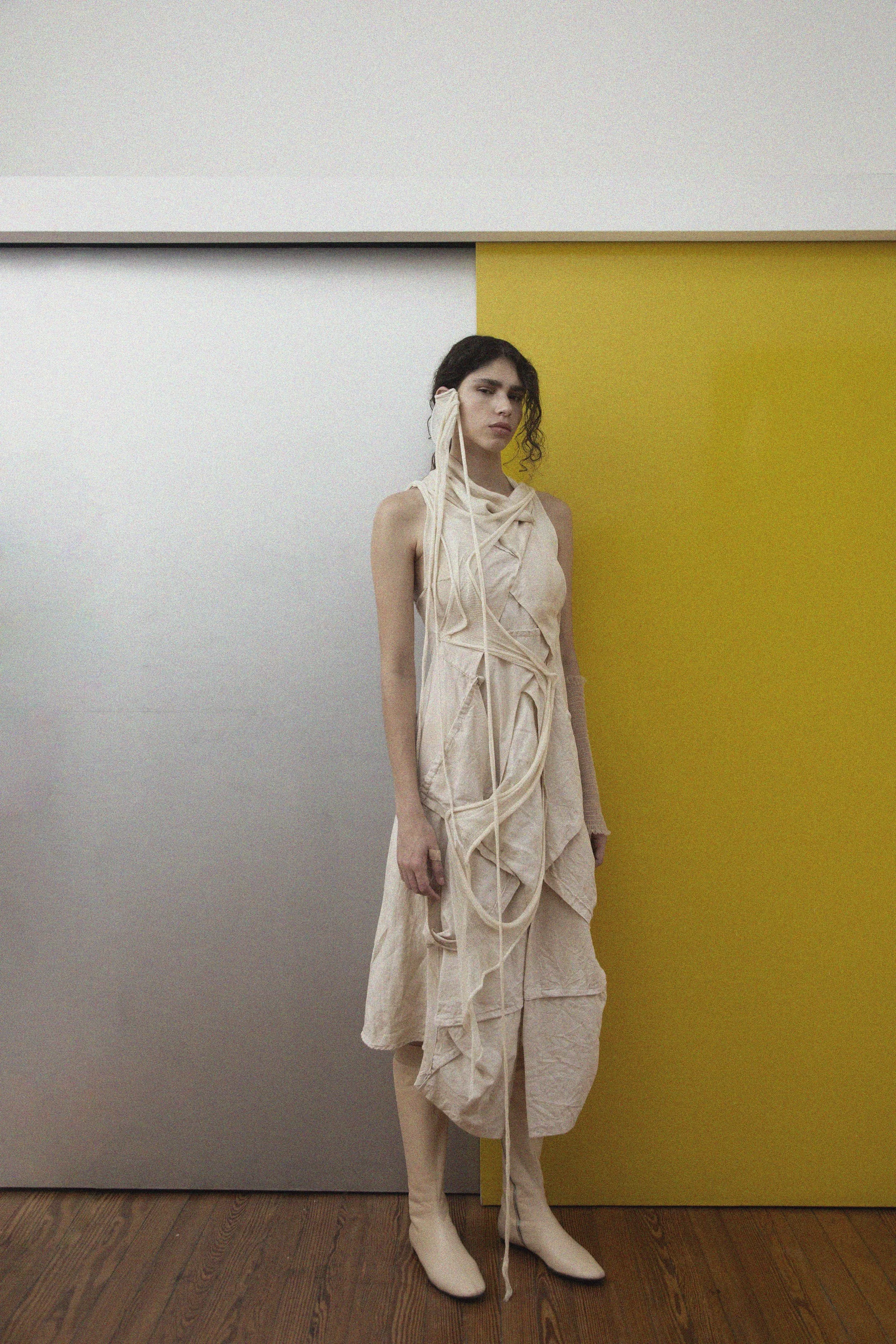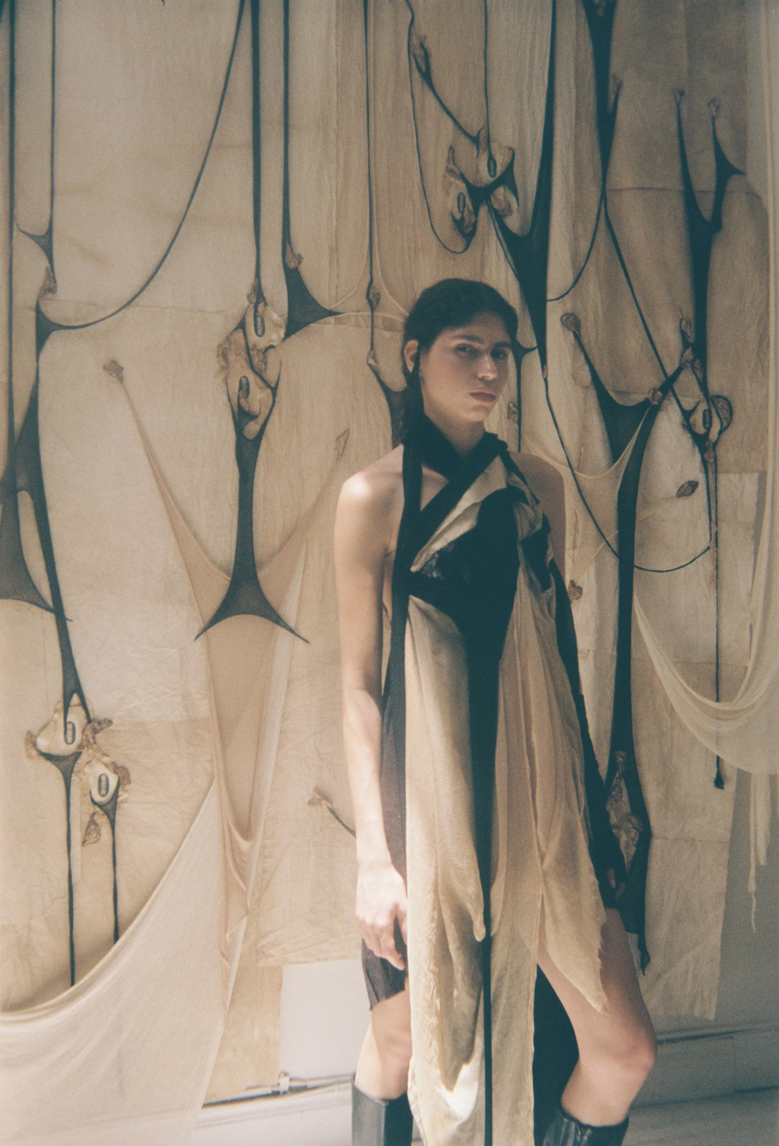 There was a sense of necessity; there wasn't the possibility of buying new things, so I reinterpreted the clothes I had at home, those my mom allowed me to use. And that's why I decided to study fashion design. Textiles are wonderful when it comes to creating – they are friendly, soft, and ethereal. I've always been fascinated by the idea of linking anatomy to textile morphology. So, circling back to the question, I actually think that sustainability was the result of a need. My materials were what was available, and transforming them was my way. Fashion was also a result; I never cared much about the world of fashion, and its rhythms always scared and internally blocked me. When I was younger, I couldn't understand how I would ever fit into that fast-paced world, as my enjoyment lies in the intentional and almost spiritual creation of each piece. So, for this reason, I would say that my work is totally and absolutely linked to art, using clothing as a creative expression.
